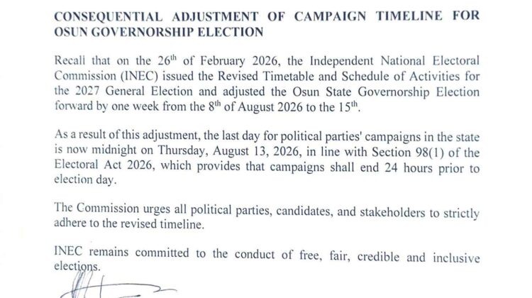 Consequentia Adjustments Of Campaign Timeline For Osun Governorship Election Apr 18, 2026 Administrator No Comment 53 Views Share on