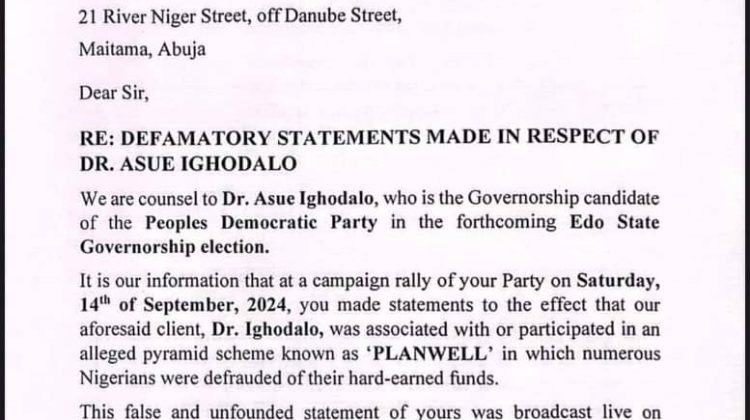 “It is our information that at a campaign rally of your Party on Saturday, 14th of September, 2024, you made statements to the effect that our aforesaid client, Dr. Ighodalo, was associated with or participated in an alleged pyramid scheme known as ‘PLANWELL’ in which numerous Nigerians were defrauded of their hard-earned funds.